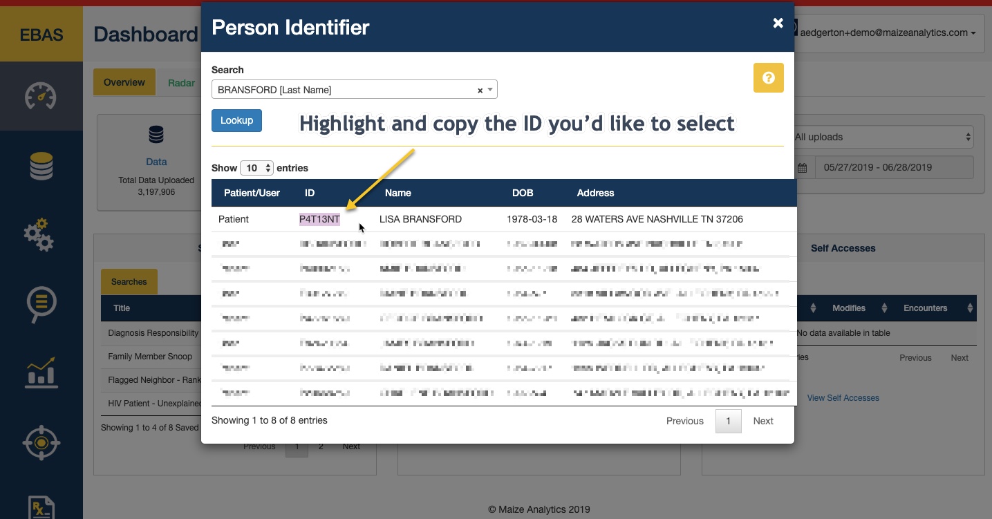 The EBAS tool features a Patient/User lookup called the Person Identifier. To access this feature click the address book towards the top right of your Dashboard.