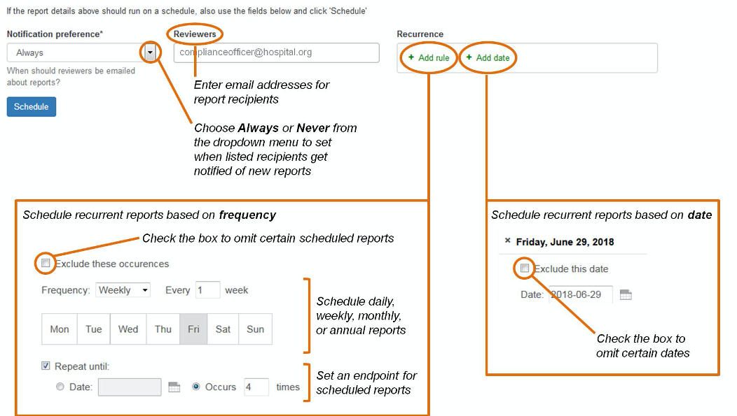 Under the Create Form, you can design reports to be generated and delivered to reviewers on a scheduled basis. To receive reports, reviewers must have “Explore accesses and review analytics” privileges. Click + Add Rule or + Add Date to set report frequencies and exclusions.
