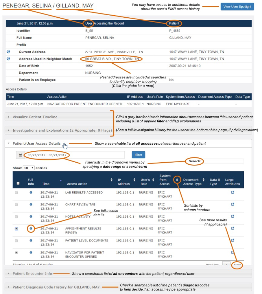 Additional User Info and Patient Info tables at the bottom of the page display dates that help provide context for accesses. These include date ranges during which certain characteristics, such as department or floor, were active.
